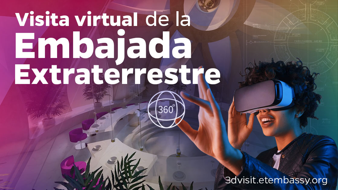 Bienvenido a la página de la visita virtual de la Embajada Oficial de nuestros Creadores Extraterrestres. Puedes hacer esta visita en una computadora, tableta o teléfono móvil, con o sin casco de realidad virtual (RV). Con un casco de RV, la inmersión es más intensa y tendrás la impresión de estar en el interior del edificio. Para una calidad óptima de inmersión, utiliza una computadora y un casco RV de buena calidad. Puedes utilizar también un teléfono móvil con un casco de RV adecuado, la calidad seguirá siendo muy apreciable. Si no tienes casco RV, no es un problema, todavía puedes hacer la visita que será muy agradable en visión panorámica de 360°. Que tengas buena visita.